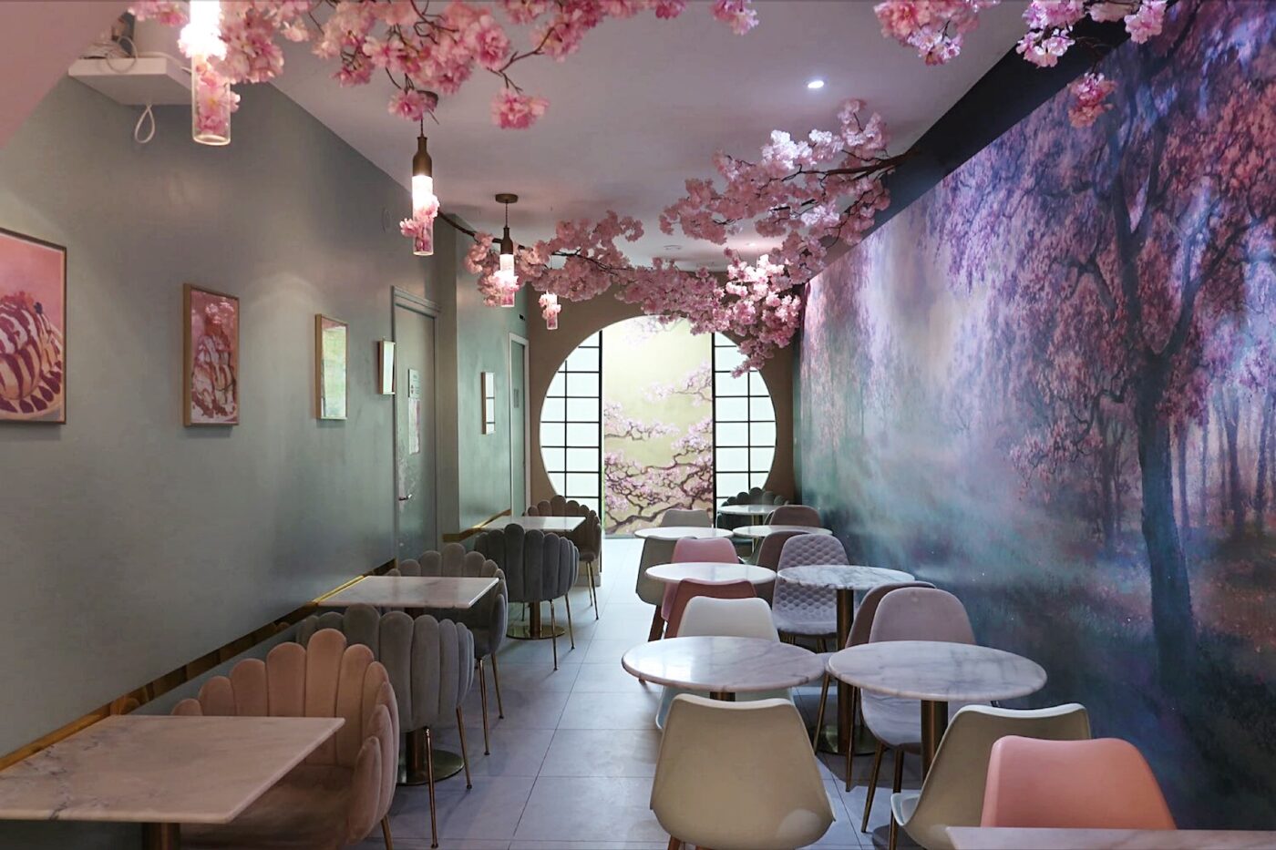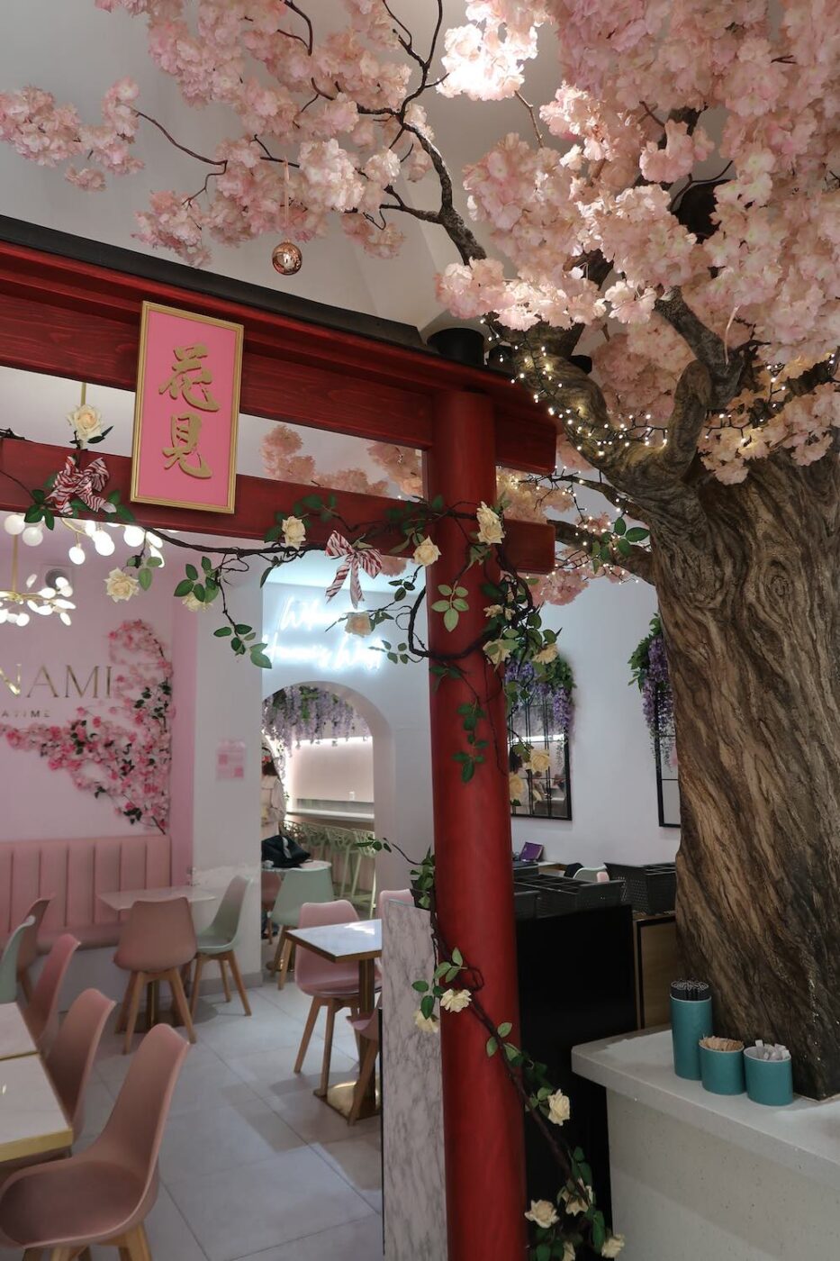 Chez Hanami Teatime, c’est d’abord la décoration qui impressionne. Dès l’entrée, nous sommes accueillis par un torī rouge qui se dresse sous les branches fleuries d’un cerisier. Ce n’est qu’un premier aperçu car le salon de thé compte en tout trois salles décorées dans un thème floral différent : la salle principale, un jardin de cerisiers roses, débouche sur une salle à la lumière plus calme, sous les glycines, avec une fresque murale peinte à la main par l’artiste Sylvain Berst. Tout au fond, une troisième salle se veut reproduire un jardin suspendu.