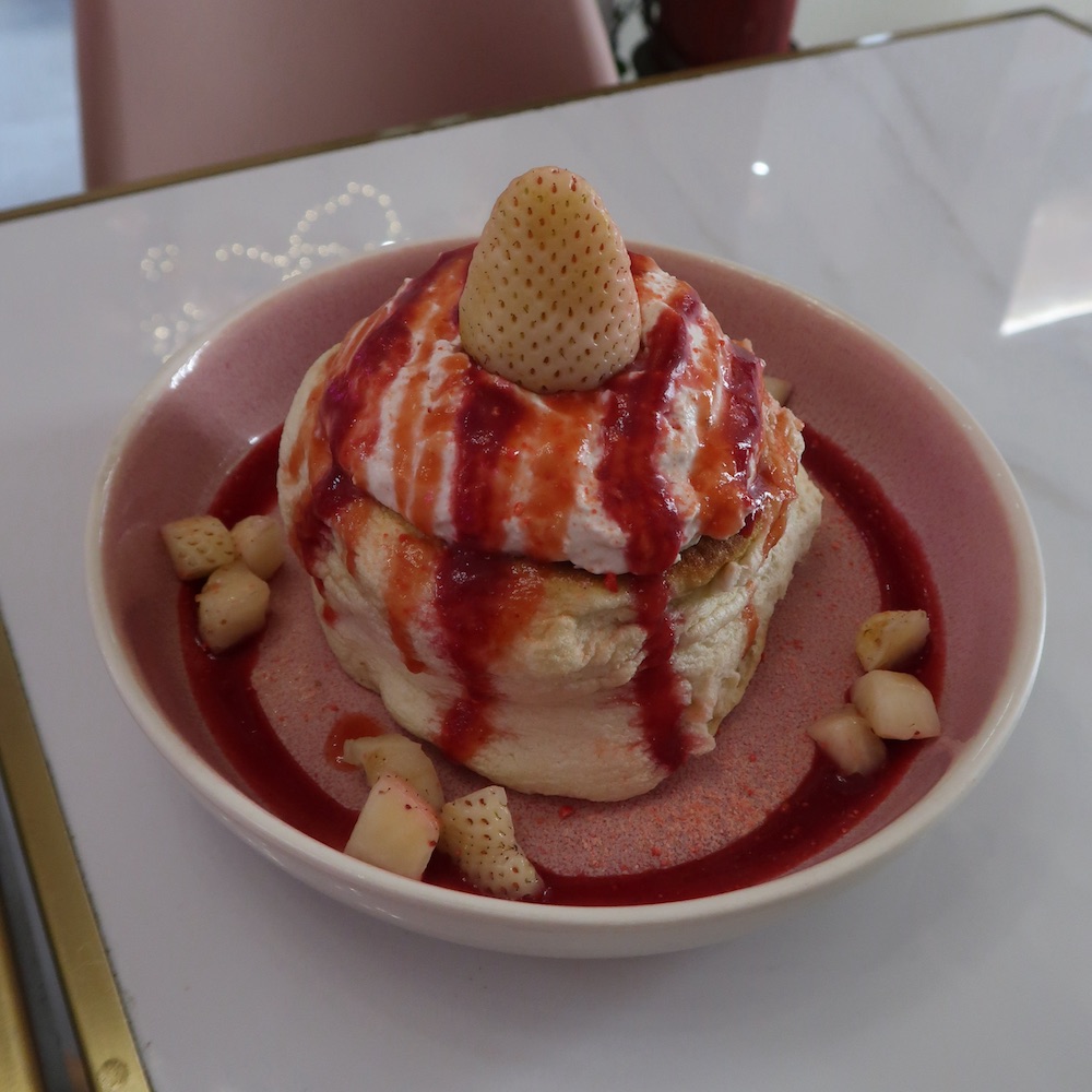 Quant aux boissons signature, elles s’inscrivent parfaitement dans le thème floral de l’enseigne. La boisson Sakura litchi, agrémentée de perles de konjac, séduit par sa fraîcheur : l’eau pétillante met en valeur des notes délicates de litchi et de fleur de cerisier, sans excès de sucre. La boisson Pétale de rose (eau pétillante, rose, framboise) donne l’impression de voir des pétales tournoyer dans son verre. La rose domine dans cette boisson rafraîchissante, parfaite pour accompagner un pancake sucré.