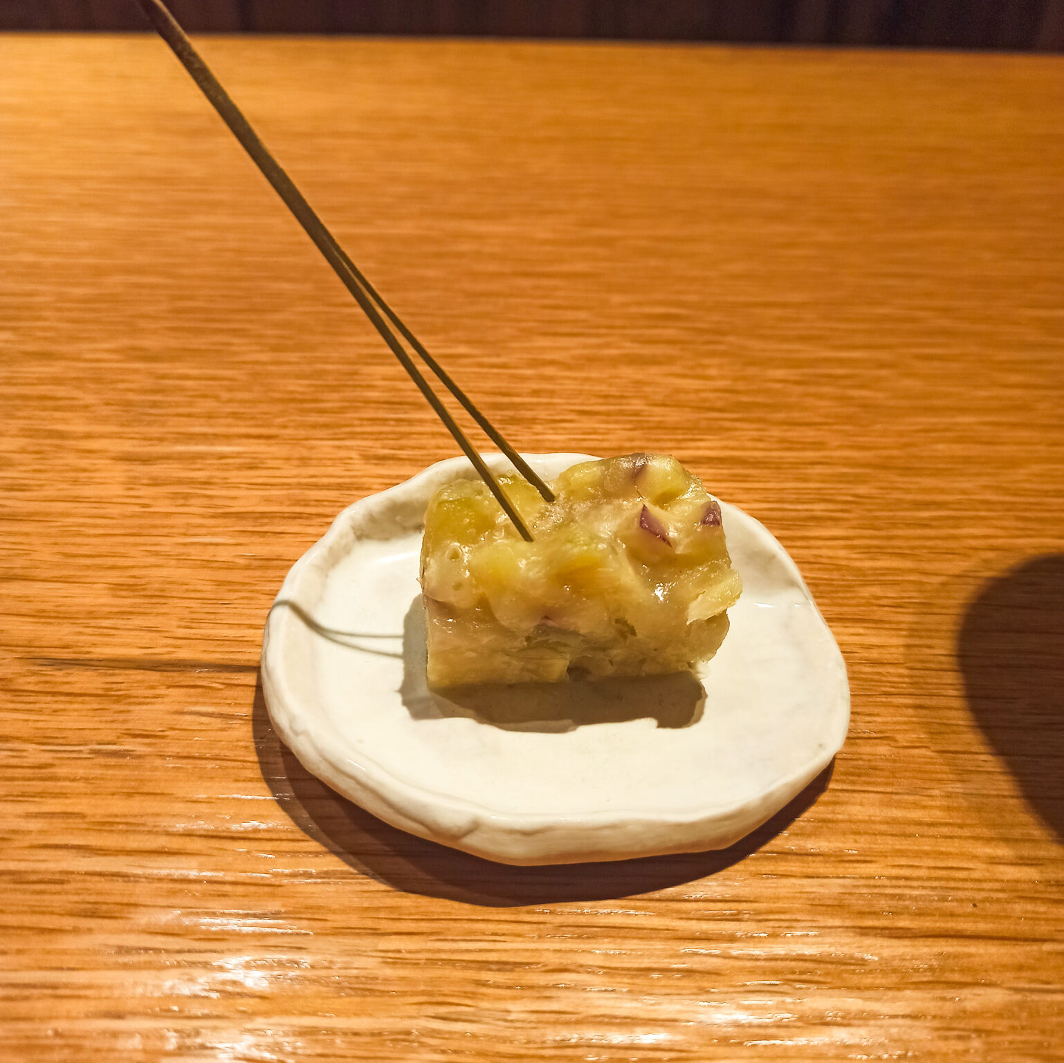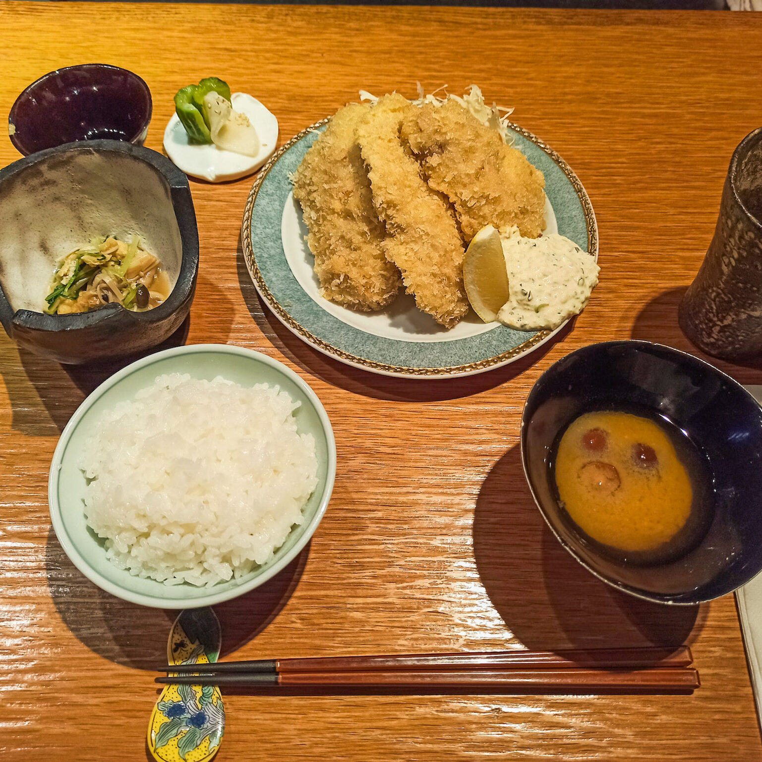 Si le restaurant est idéal pour dîner et découvrir la spécialité de la maison, le chef Shodai propose depuis peu une nouvelle formule du midi de type teishoku (25€), composée d’un plat principal à base de friture – au choix karaage ou aji furai (chinchard frit) – accompagné de sauces, d’assaisonnements et de tout un tas de petits plats disposés dans de jolies céramiques : soupe miso aux nameko (petits champignons japonais), bol de riz, légumes verts, kinoko et aburaage (tofu frit), pickles pour accompagner le riz… La carte change tous les jours et les accompagnements varient eux aussi au fil des saisons, tout comme le petit dessert servi en fin de repas et inclus dans la formule pour finir sur une note sucrée. De passage en automne, on a la chance de déguster un gâteau chaud à base de satsuma imo (patate douce japonaise), tout droit venu de Nagoya, la région d’origine du chef.