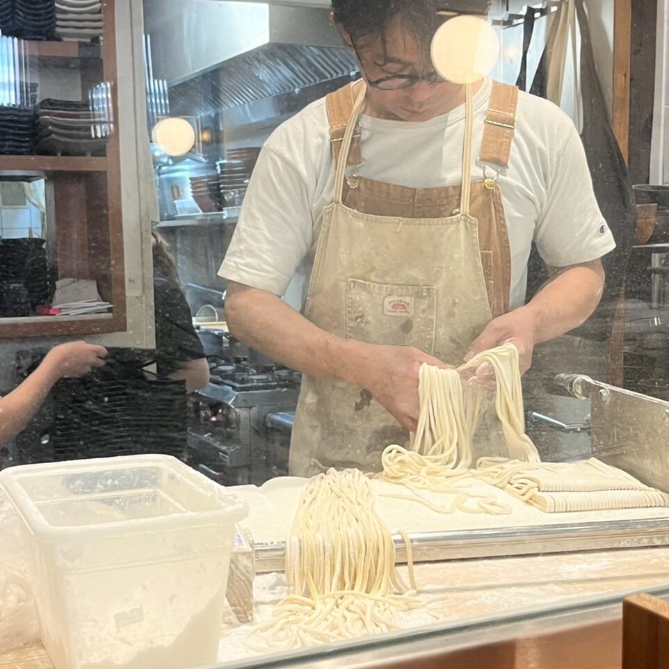 Chez Udon Kisin, les udon sont préparés chaque jour avec une farine 100 % importée de Kyūshū, dans le sud du Japon. Le bouillon, élaboré à partir de kombu de Hokkaidō (dans le nord) et de katsuobushi (bonite séchée) de la maison Tsukiji-Wadakyu, offre une base savoureuse et subtile. L’eau utilisée est adoucie pour préserver la finesse des arômes, et aucun additif chimique ni conservateur n’est ajouté à la préparation.