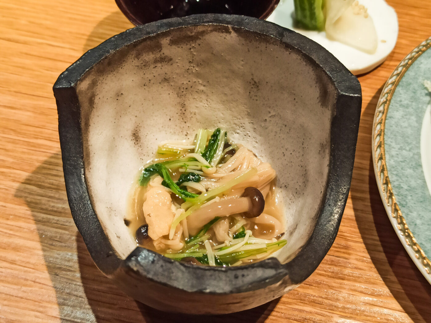 Les petits plats préparés devant nous arrivent fumants les uns après les autres dans de jolies céramiques avant de recouvrir le comptoir : soupe miso aux nameko (petits champignons japonais), bol de riz, légumes verts, kinoko et aburaage (tofu frit), pickles pour accompagner le riz, et enfin les plats principaux à base de friture.