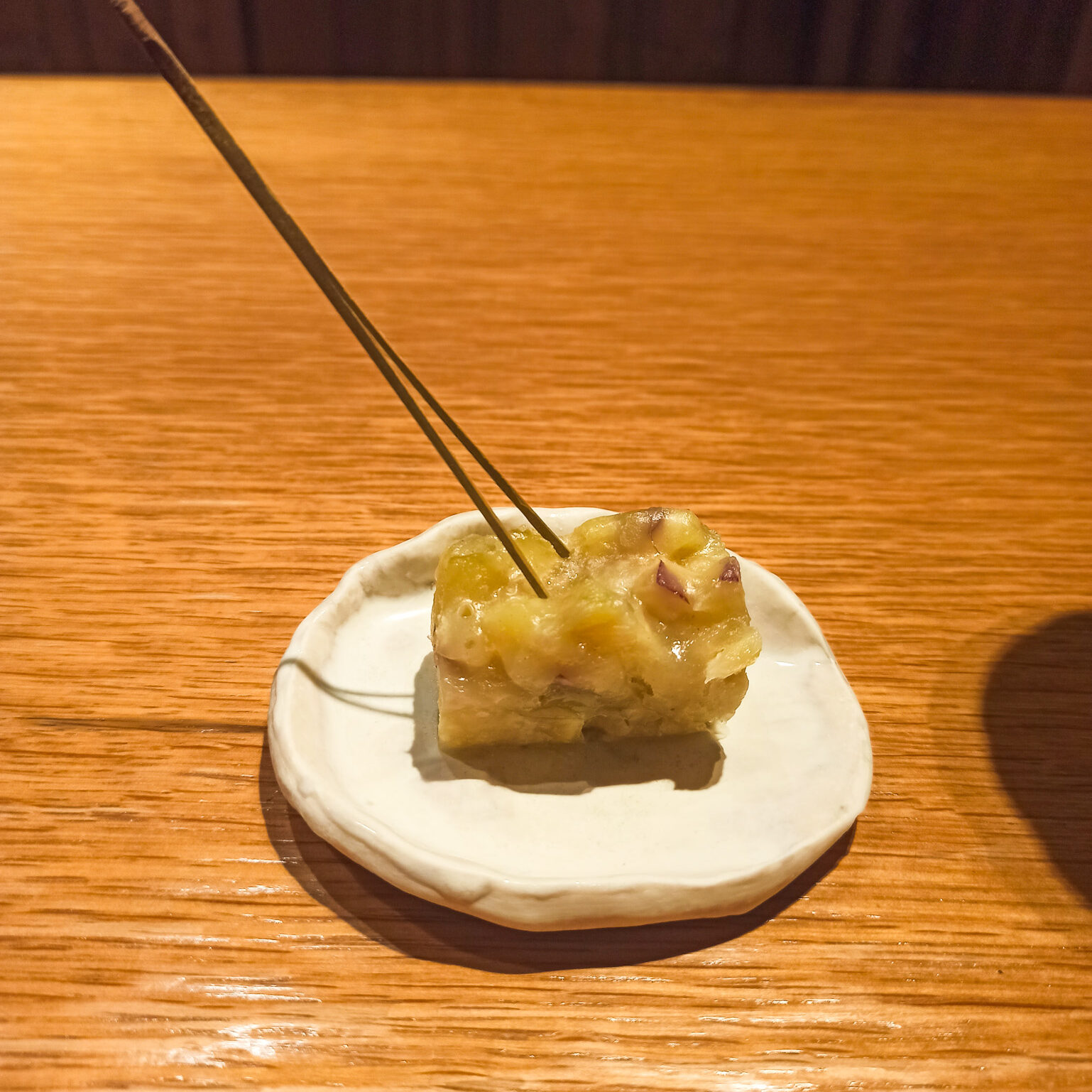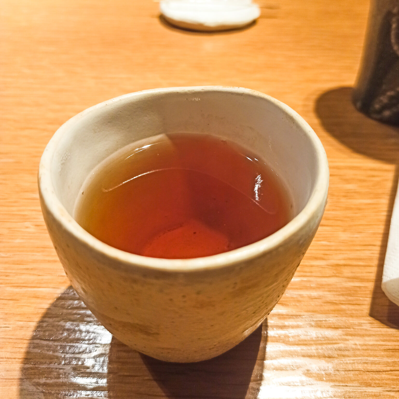 Pour terminer sur une touche sucrée, le chef nous partage un petit dessert chaud à base de satsuma imo, patate douce japonaise à la peau violette et à la chair jaune, dont le goût se révèle sucré et réconfortant. Tout en simplicité, ce gâteau tout droit venu de Nagoya, ville d’origine du chef, nous rappelle des saveurs auxquelles nos palais français ne sont pas ou plus habitués. Alors que l’on s’apprête à quitter le restaurant, ravis de notre repas, on se laisse surprendre par un hôjicha, servi comme une invitation à prolonger encore un peu cet instant de plaisir et de chaleur pour les papilles et pour le corps.